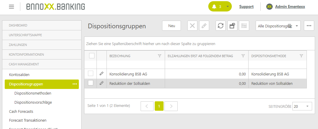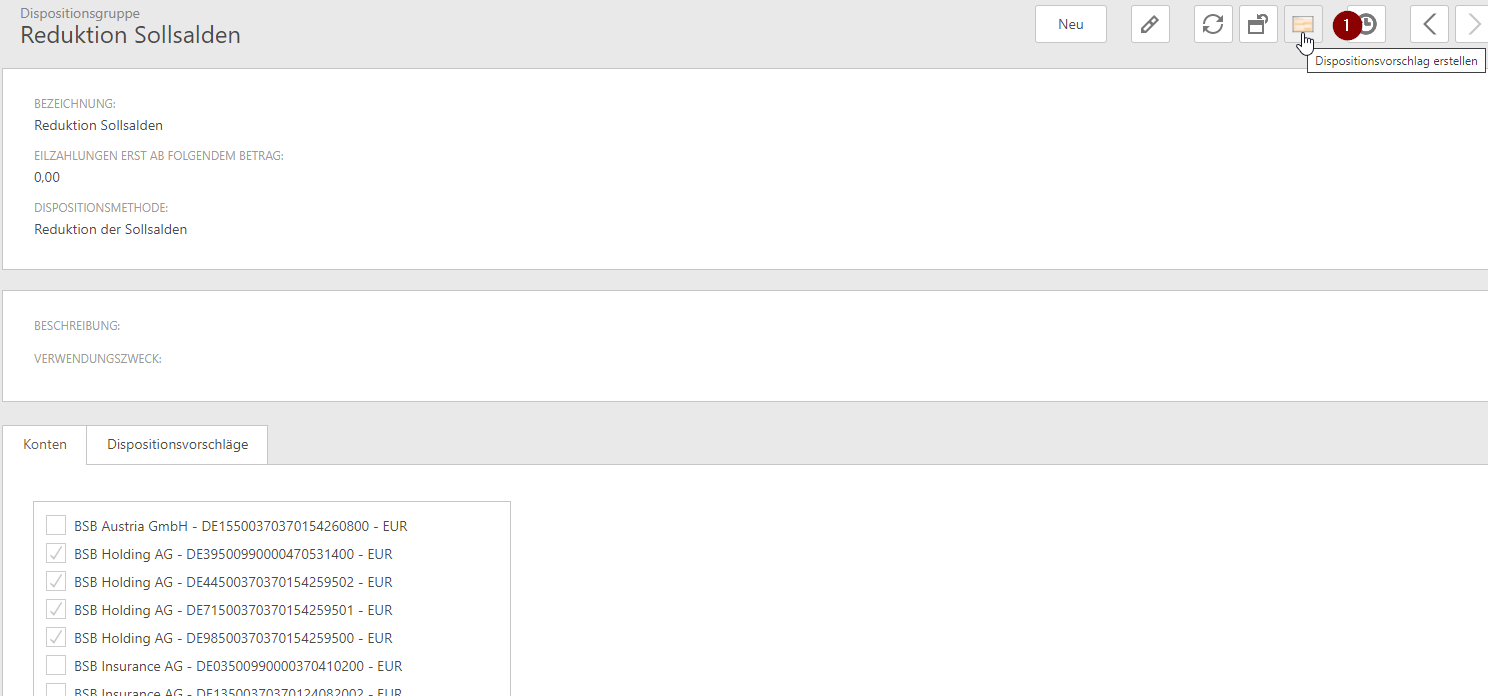 Zur manuellen Disposition wechselt man in den Menüpunkt "CASH MANAGEMENT - Dispositionsgruppen" in die entsprechende Gruppe. Falls für eine ad hoc Dispo die Verwendungszweckvorgabe oder der Kontenkreis geändert werden muss, im Bearbeiten-Modus .