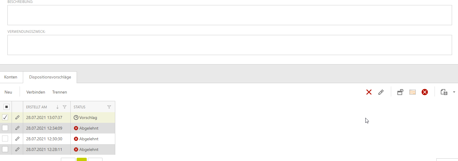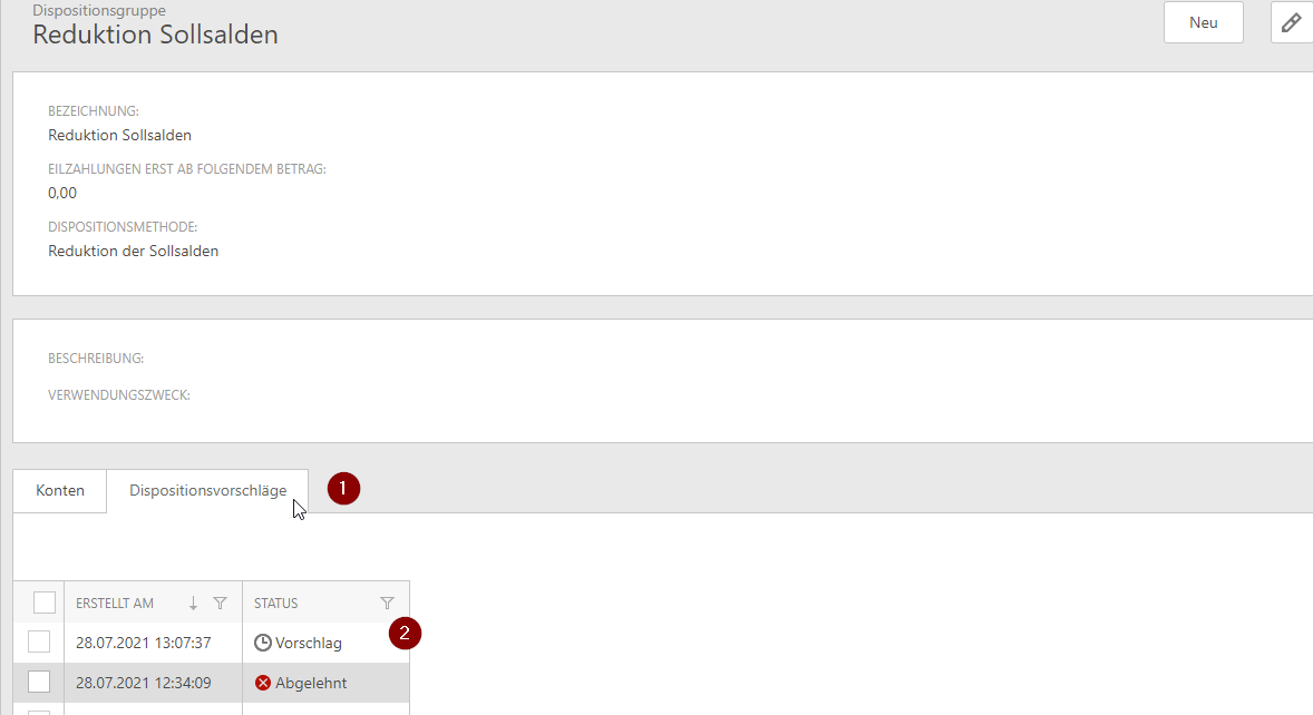 Im Folder "Dispositionsvorschläge" (1) findet man die einzelnen Vorschläge (2) mit Status und Zeitstempel der Erstellung.