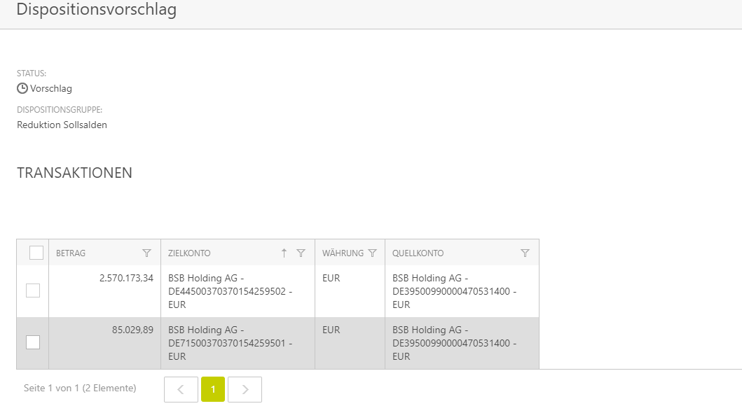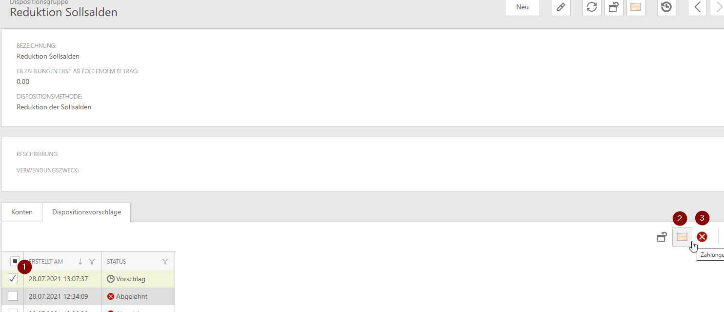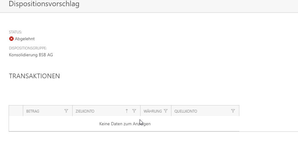 HINWEIS: Sollte auf Grund der aktuellen Saldensituation keine Umbuchung notwendig sein, wird ein Leer-Vorschlag (ohne Transaktionen) im Status "Abgelehnt" erzeugt.