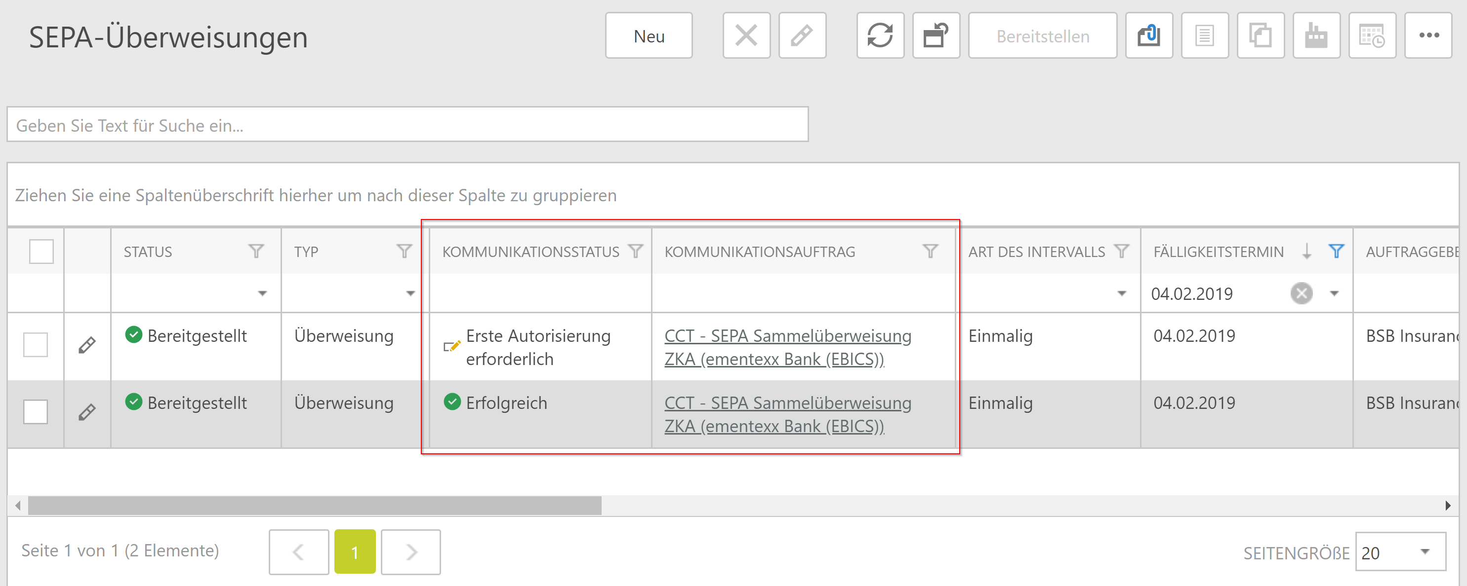 Nach der Bereitstellung einer oder mehrerer Zahlungen werden die in diesem Zuge erstellten Kommunikationsaufträge automatisch mit diesen Zahlungen verknüpft. Der Status sowie ein Link zum jeweiligen Kommunikationsauftrag kann dann über die beiden Spalten "Kommunikationsstatus" und "Kommunikationsauftrag" eingesehen werden.