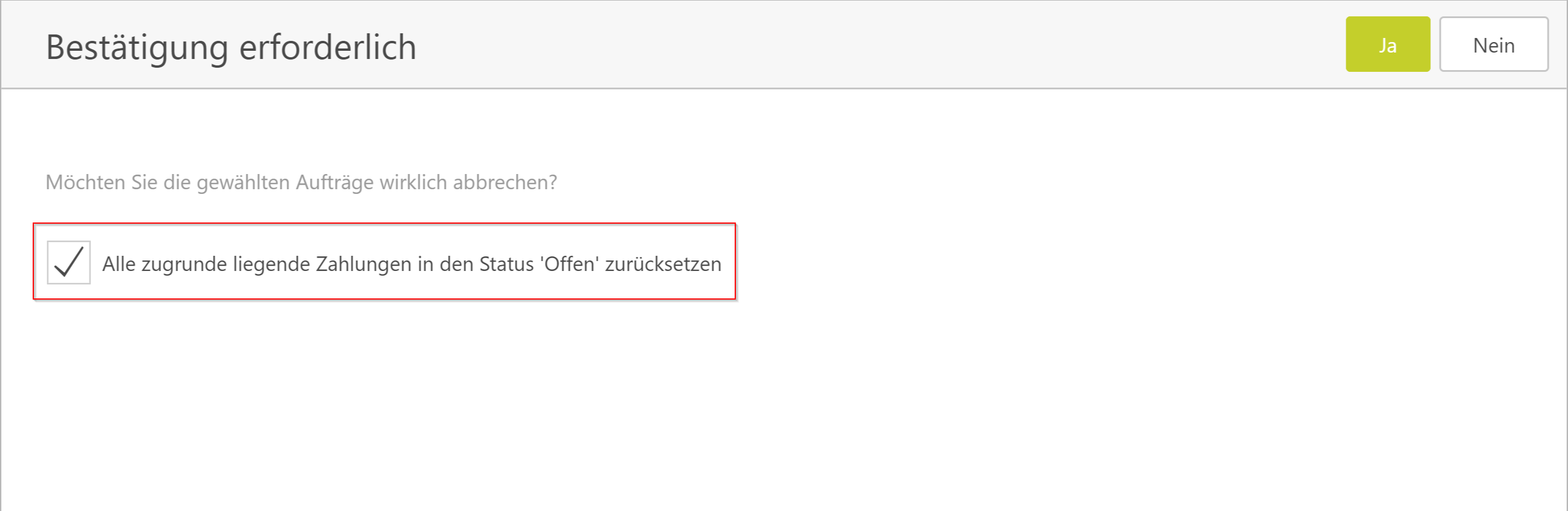 Wird ein Kommunikationsauftrag durch einen Benutzer manuell abgebrochen, ist es optional möglich, die zugrunde liegenden Zahlungen wieder in den Status "Offen" zu versetzen. In diesem Fall wird die Verknüpfung entfernt und die Zahlungen können dann nachbearbeitet und anschließend erneut bereitgestellt werden.