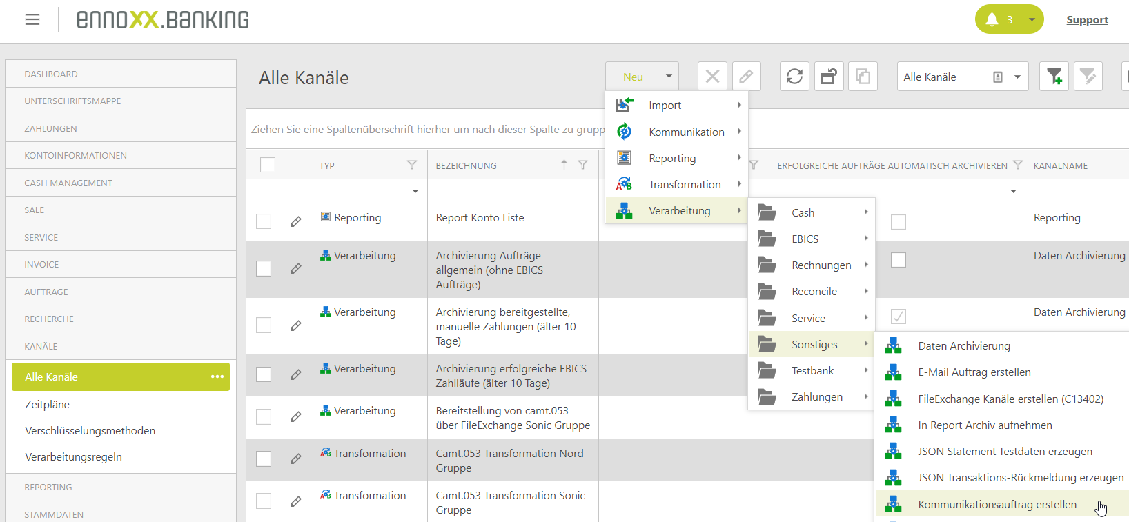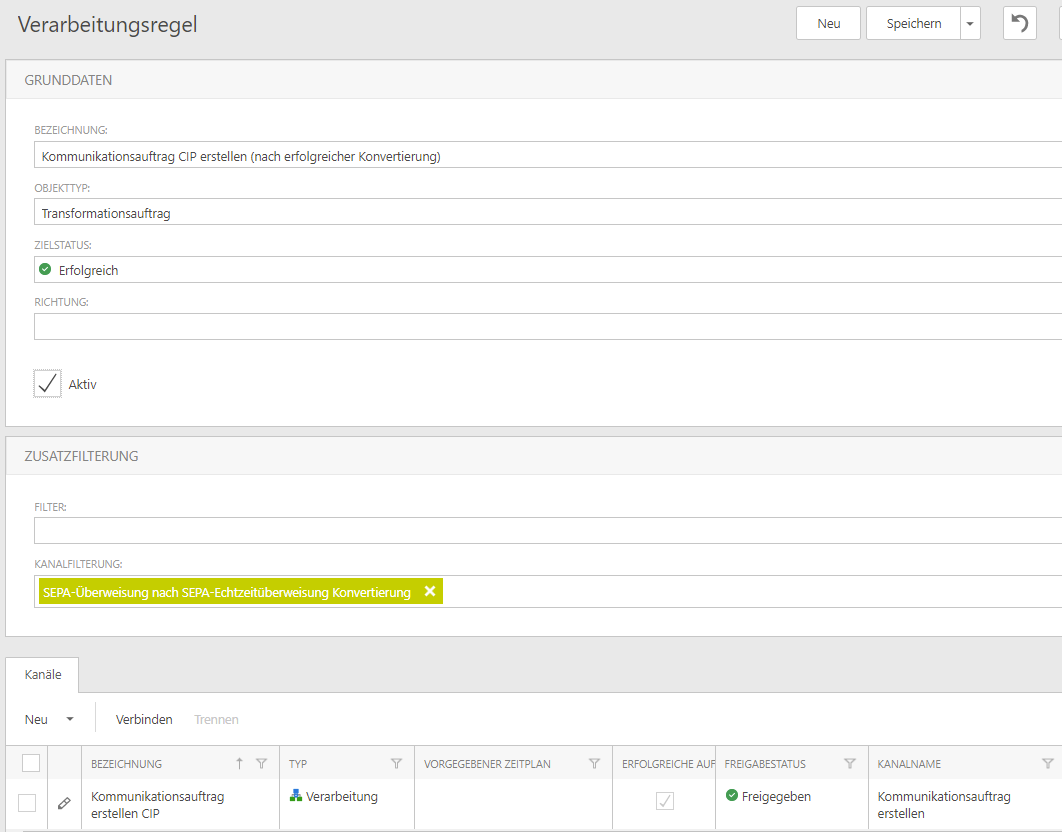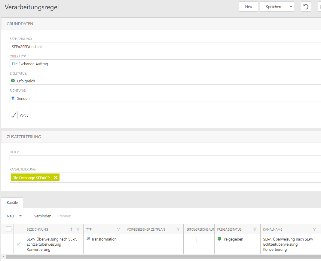 2. Create a processing rule. Here in the example payment files are posted via File Exchange in ennoxx.banking. If the job (see filter) is successful, the conversion should be executed.