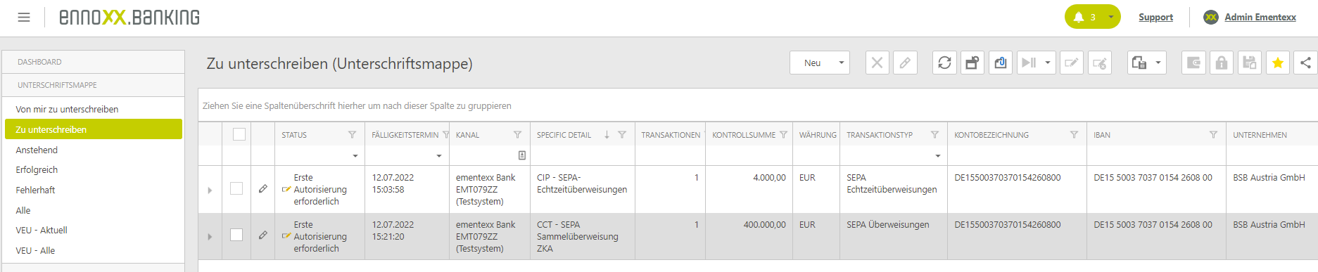 In the example below, a payment file with 2 transactions was converted. As a result one receives a CIP EBICS job - with one transaction over 4.000,00 EUR and a CCT EBICS job - with a transaction over 400.000,00 EUR.