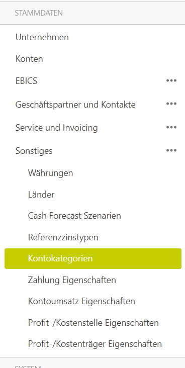 The account categories are administered under the menu item " MASTER DATA - ACCOUNT CATEGORIES".