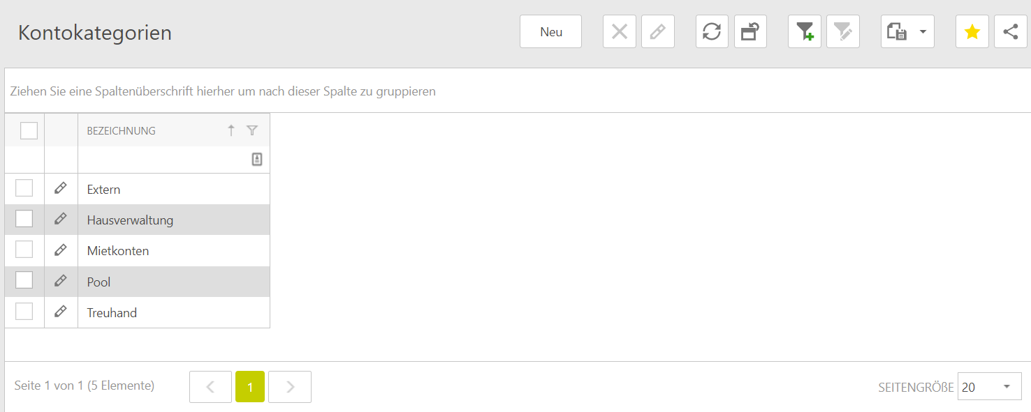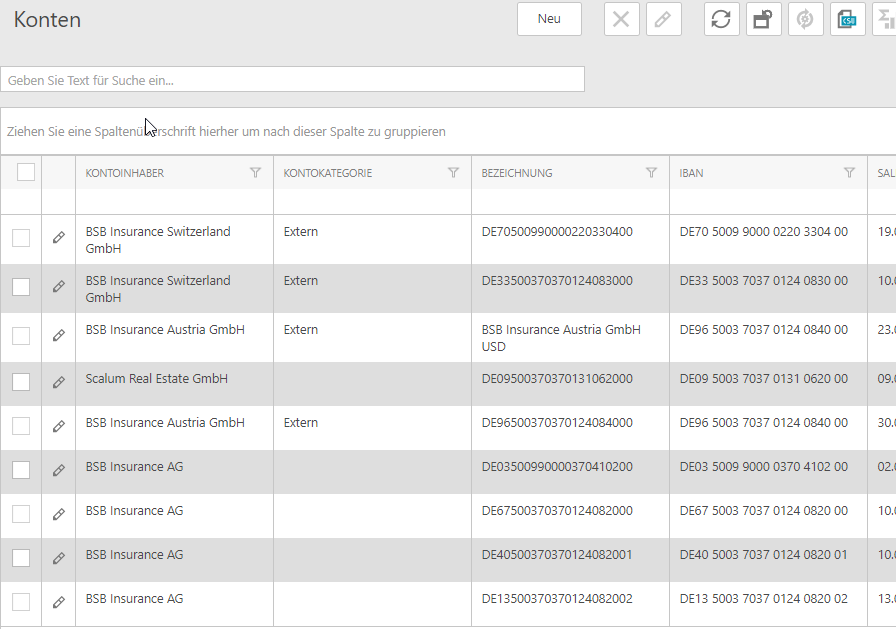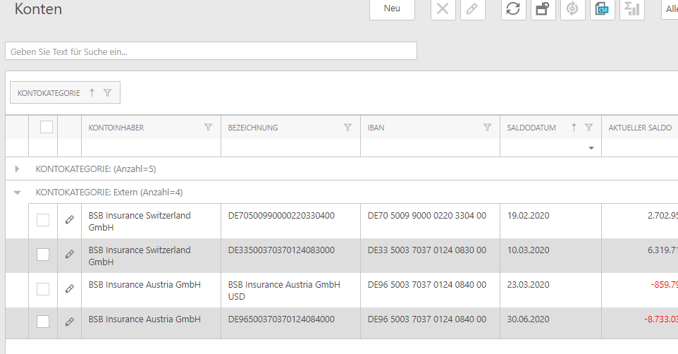 The properties of ordering party accounts administered in ennoxx.banking have so far mostly been described in more detail only via the account type. Now, each account can also be assigned an account category. This results in new possibilities for searching, filtering, sorting and grouping. The field is available in all necessary areas in the ListView as well as in the GridLookUp.