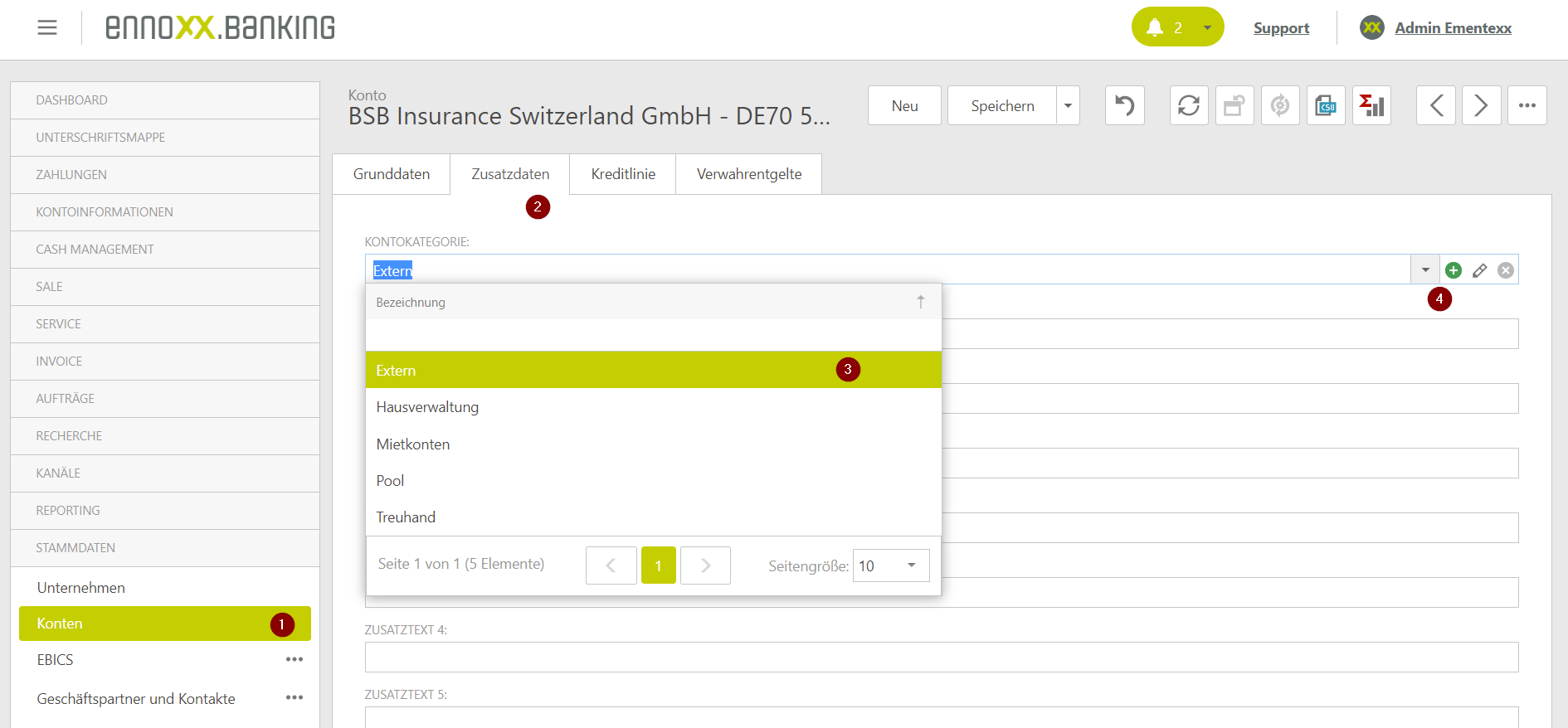 Defined account categories can then be assigned to the respective account under the menu item " MASTER DATA - ACCOUNTS (1)". In edit mode, select the category under the "ADDITIONAL DATA (2)" tab (4). If necessary, a new category can also be created directly here (3).
