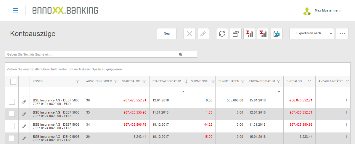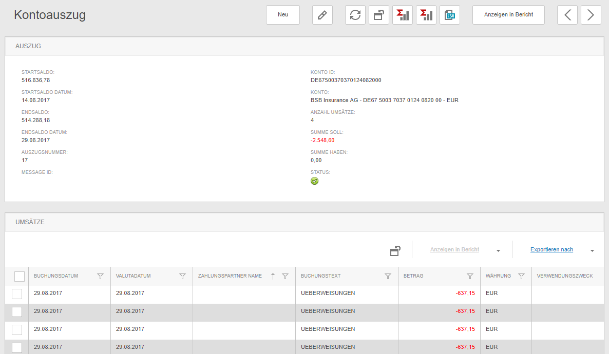 In the view of the account statements all information of the retrieved records is displayed. By filtering or grouping, the data can also be displayed per company or date.