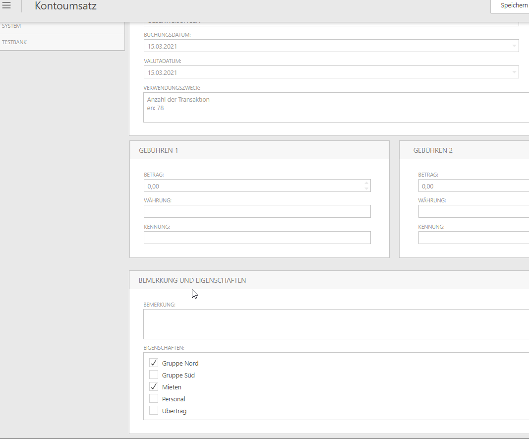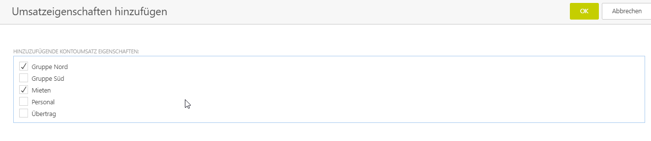 Freely defined properties can be created and assigned for account transactions. For example, a subdivision into categories is possible. For details on how to create properties and how to assign them automatically, see Properties for account transactions.