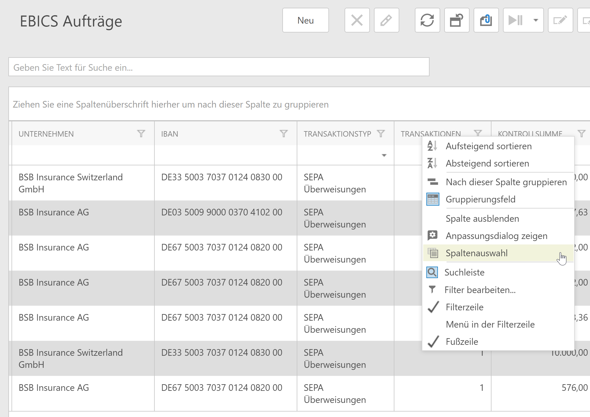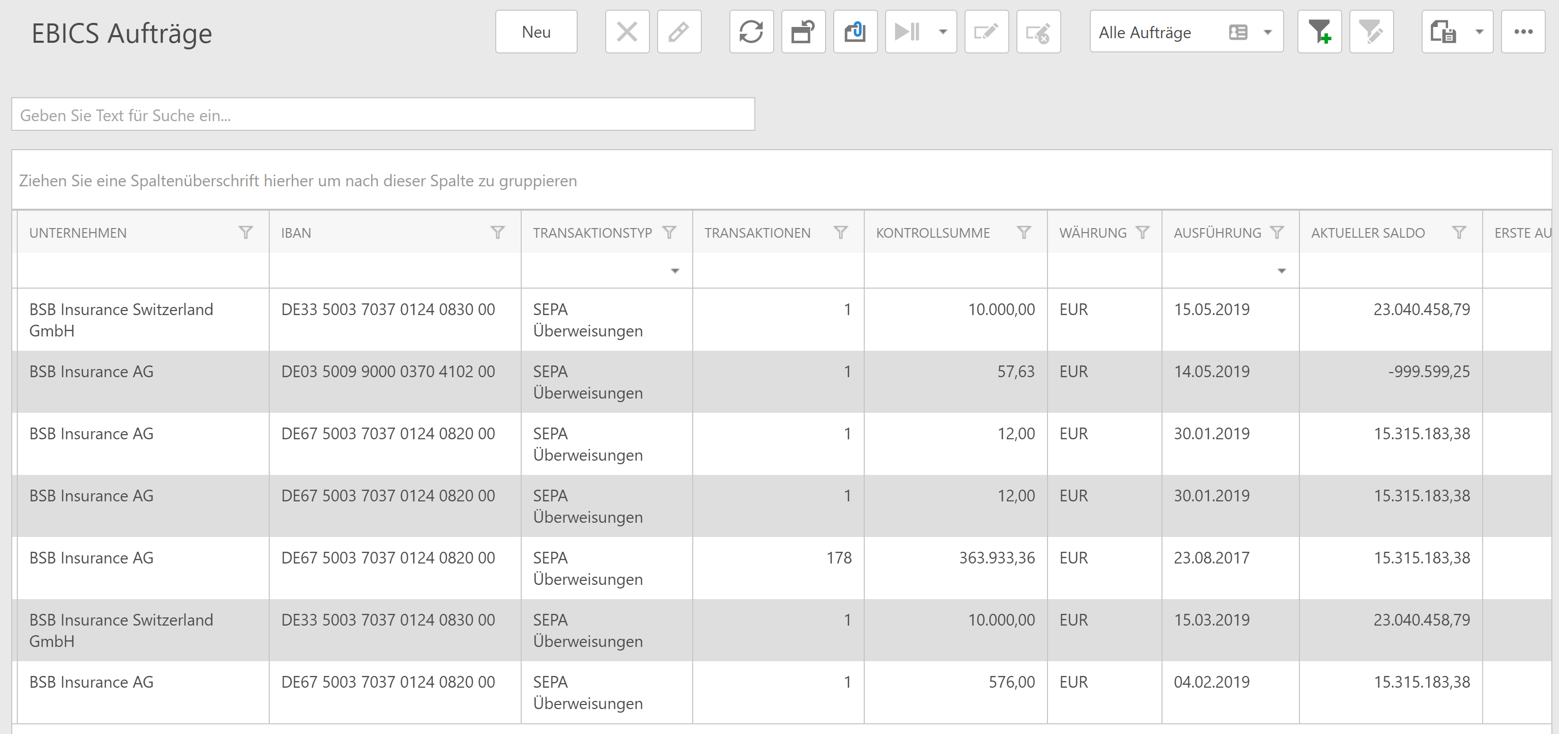 In the job list views, the additional columns "Company", "Account", "IBAN", "BIC", " Checksum", "Currency", "Transactions", "Execution" and " Account Balance" provide an overview of the contents of the current payments and account balances already at the top level: