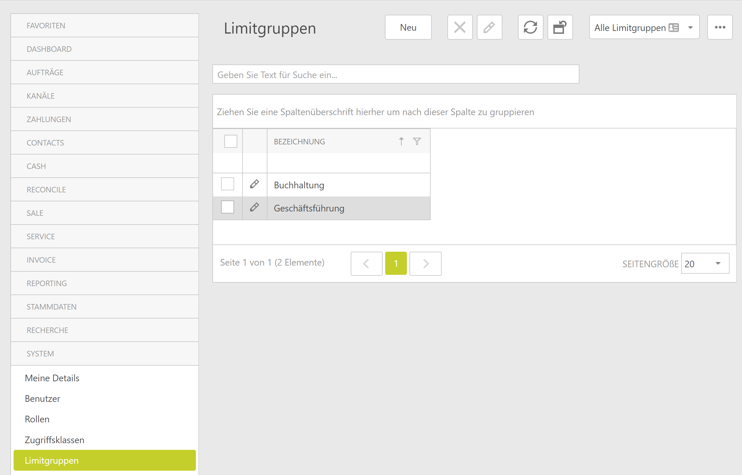 For the configuration of the limits, a limit group must be created in the first step. The overview of the existing limit groups can be found in the navigation group "System":