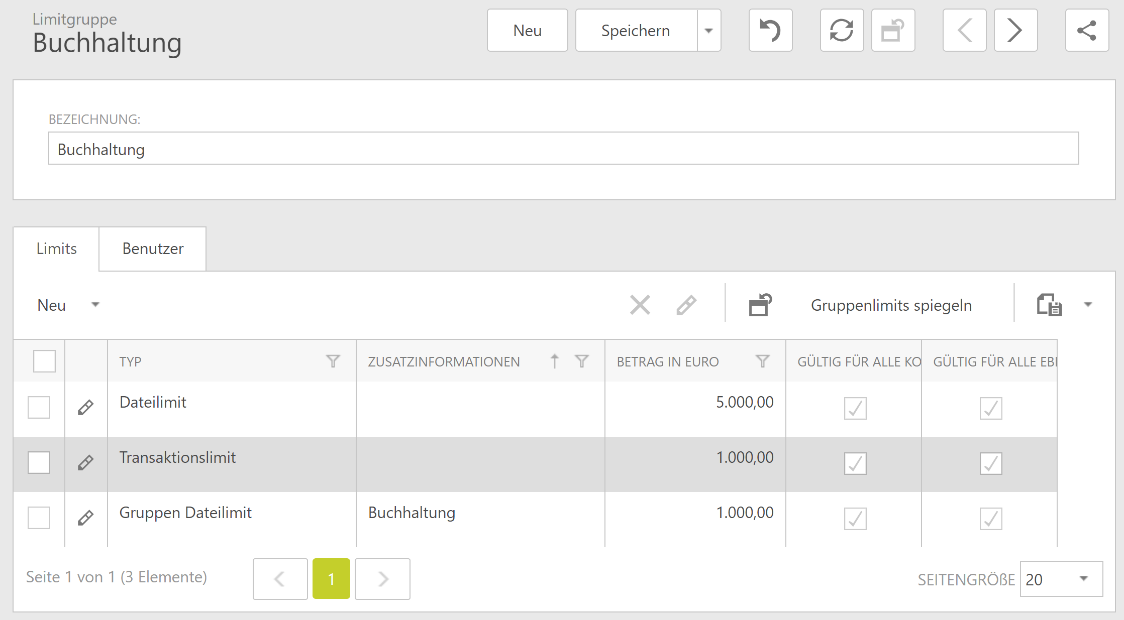 The following example shows a limit group "Accounting" in which a file limit, a transaction limit, as well as a group file limit has been set with the limit group "Accounting". All three limits apply to all accounts and all EBICS order types. A user assigned to this limit group can thus sign a payment file with a total amount of up to 5,000.00 EUR, provided that no single transaction exceeds 1,000.00 EUR. If two users from the limit group "Accounting" want to sign together, however, the group file limit of 1,000.00 EUR applies for the second signature.