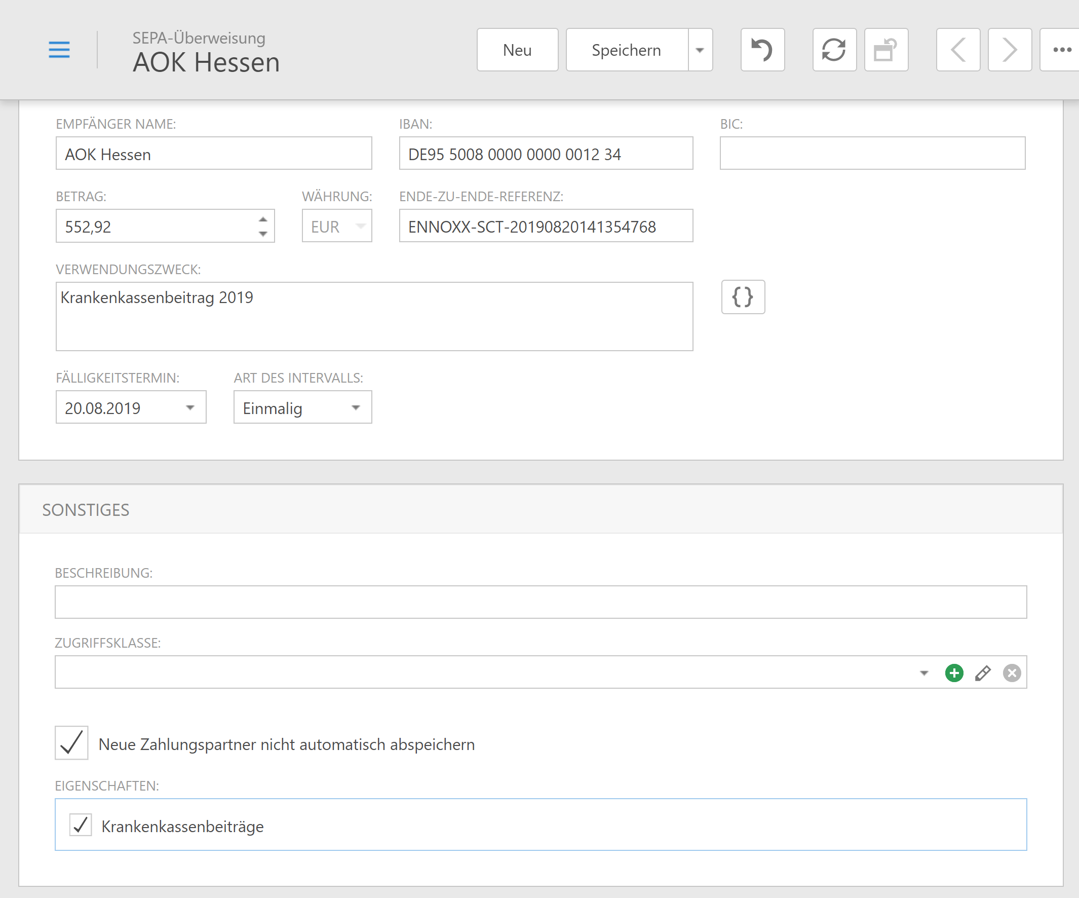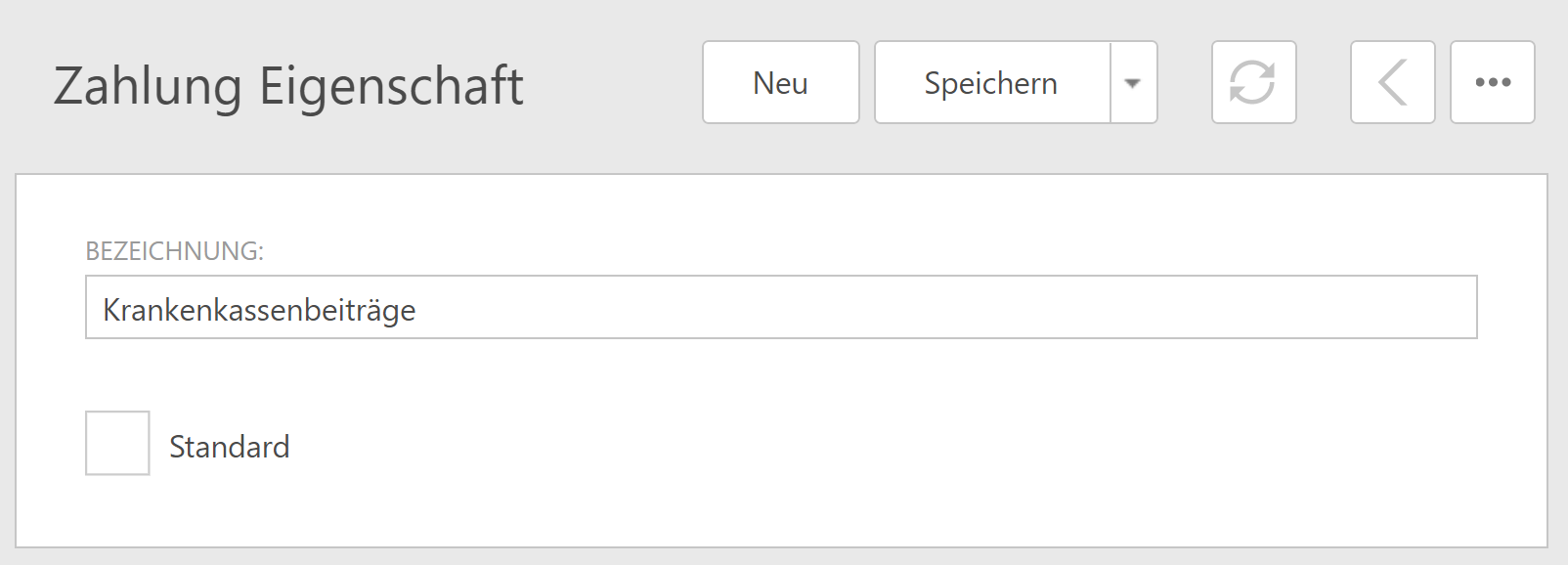 This property can then be manually assigned to any payment. If the "Default" checkbox has been activated, the property will always be assigned automatically when a new payment is created.